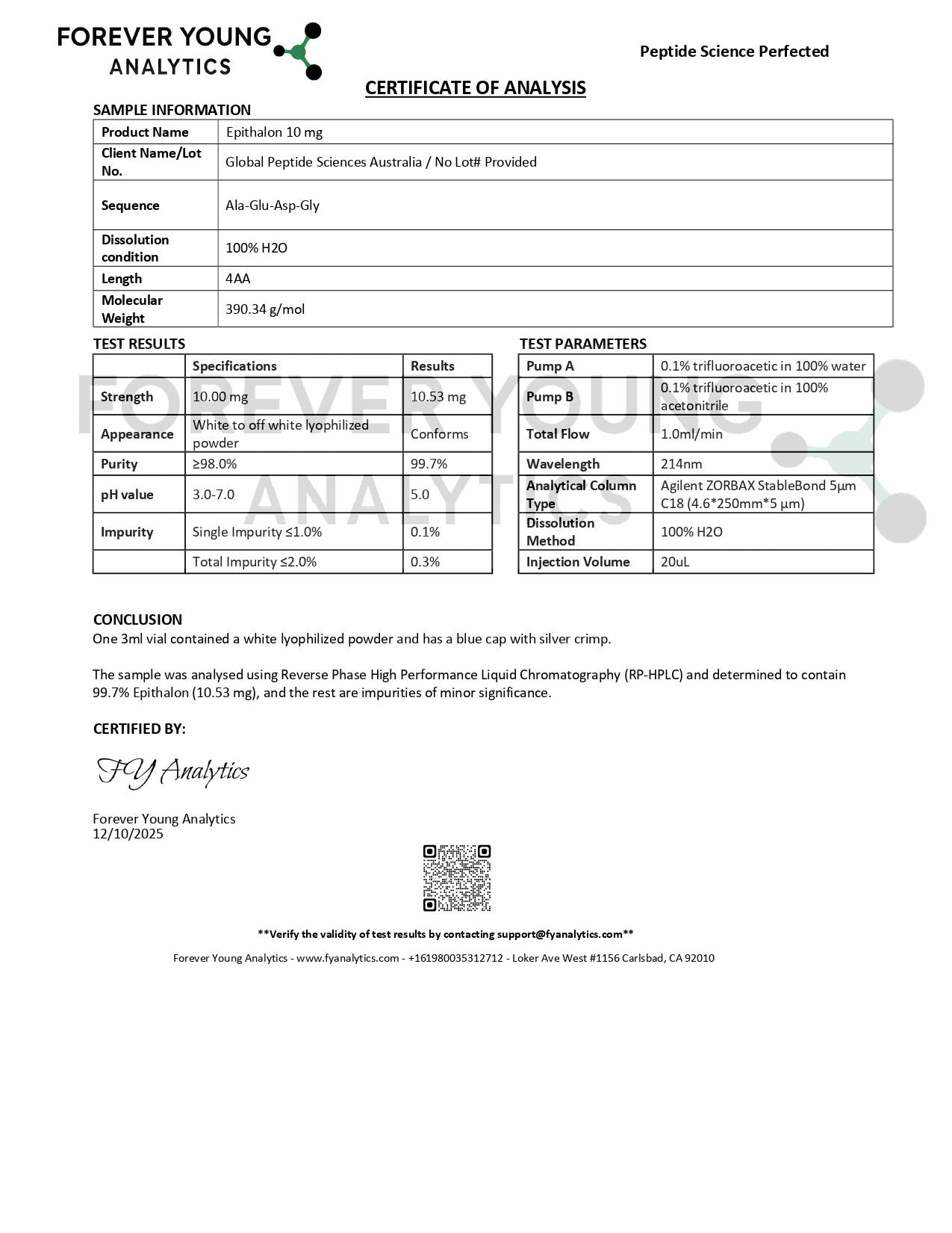 Global Peptide Sciences is an Australian vendor of peptides that has been in business for 5 years. They provide Certificates of Analysis (COA) and use HPLC testing for their products, and have no FDA warnings. Their trust score is 58.75 (C).